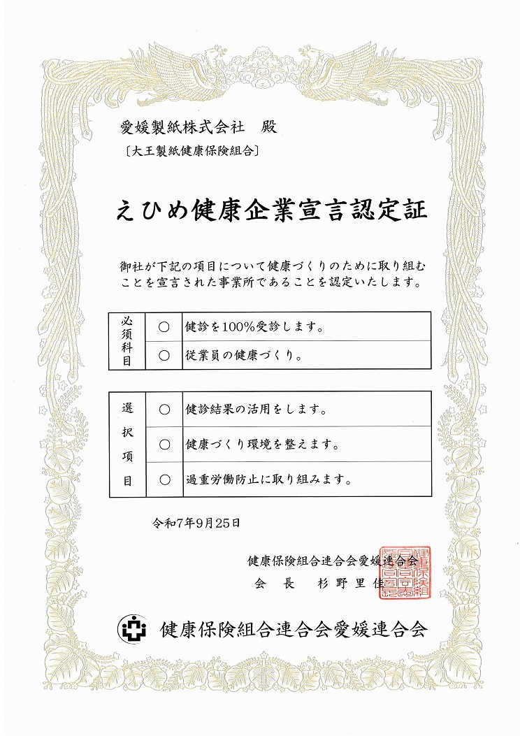 健康保険組合連合会愛媛連合会より、健康づくりのために取り組むことを宣言した事業所であることが認定されました。